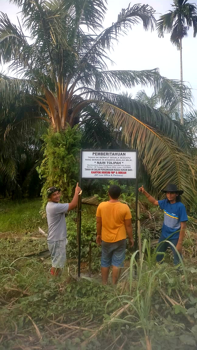 Pemasangan plang nama dilakukan dikarenakan adanya pihak ketiga yang mengeklaim atau mengaku-ngaku pohon sawit yang berada di atas tanah tersebut adalah miliknya.